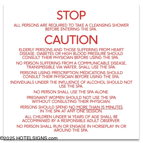 Expertly printed digital graphics provide easy-to-read spa rules and regulations; braille is not required on this sign per ADA regulations.