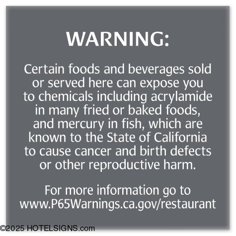This sign, GSS-P65A-POSfb, is compliant with current regulations listed in the California Proposition 65 Law and Regulations. For further information, visit our signage codes and regulations page.
