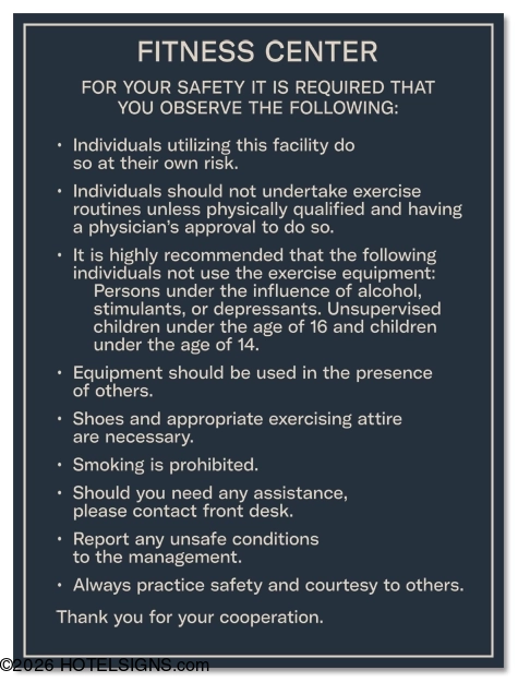 - Required to be posted inside the Fitness Center to inform and warn guests of the center's rules and policies.
