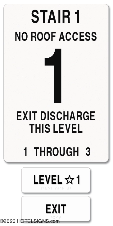 NOTE: Package includes stairway ID sign, tactile level ID sign, tactile exit sign, and low-level photoluminescent egress sign.