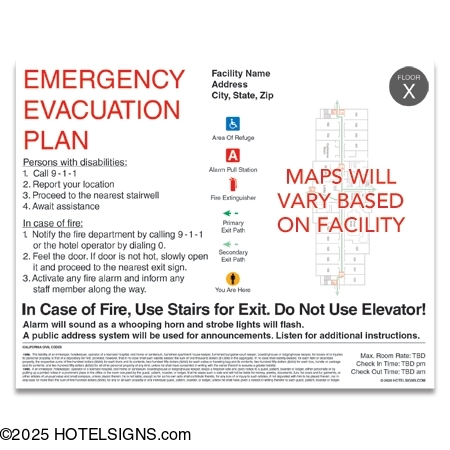 Complies with California Fire Code section 404.6.2 that states specific evacuation maps must be posted on the interior of the entrance door to each guest room in a hospitality facility.