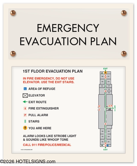 Clearly identify exits, exit routes, fire extinguishers, pull alarms, stairs, and current location in the event of an emergency.