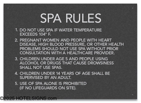 Expertly printed digital graphics provide easy-to-read spa rules and regulations; braille is not required on this sign per ADA guidelines.