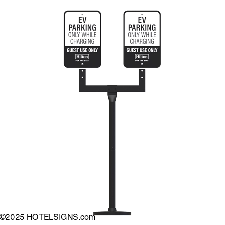 Includes two (2) Hilton EV Parking Only Signs, post, base, U-bracket, and nut/bolt set; drill holes aid in easy installation.