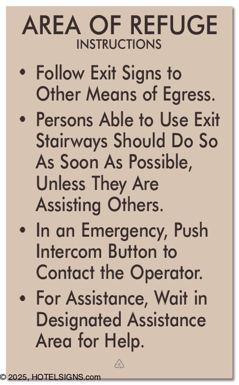 This sign, EBW-AR1912, is compliant with current regulations listed in the International Code Council, or ICC. For further information, click the following link, https://codes.iccsafe.org/content/IBC2018P4/chapter-10-means-of-egress#IBC2018P4_Ch10_Sec1009.9, for individual codes (IBC Chapter 10, Section 1009.11; CBC Chapter 10, Section 1009.11; NYC Chapter 10, Sections 1007.9; 1007.11).