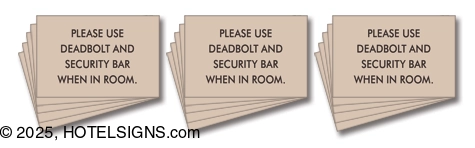 - Use to inform guests to use deadbolt and security bar when in rooms.