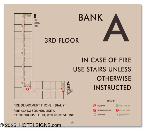 Clearly identify exits, exit routes, fire extinguishers, pull alarms, stairs, and current location in the event of an emergency.