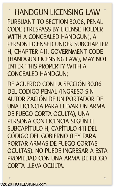 Any Texas property that wishes to prohibit license holders from carrying guns, either openly or concealed, on their premises must have these signs posted in a conspicuous manner visible to the public. Properties that allow open carry but not concealed carry must have 30.06 (page 5) code number. Properties that allow concealed carry but not open carry must have 30.07 (page 5) code number. Properties who do not allow either open and concealed carry guns must purchase both signs.