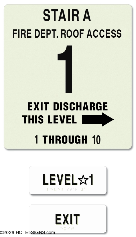 NOTE: Package includes MEA-certified photoluminescent stairway ID sign, tactile level ID sign, and tactile exit sign.
