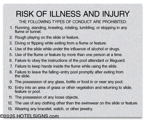Inform and warn guests of water slide rules and policies with the Georgia Water Slide Risk of Illness and Injury Sign (SPS-PL3947-GA). This sign is required at entrances to facilities with water slides or other falling-entry features in Georgia.