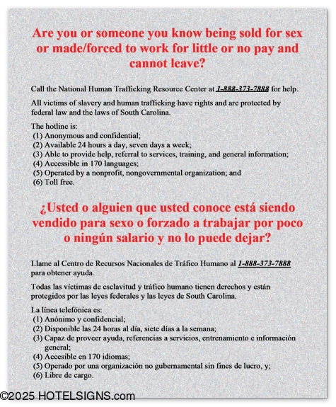 Human Trafficking Notice - South Carolina Code (English/Spanish)