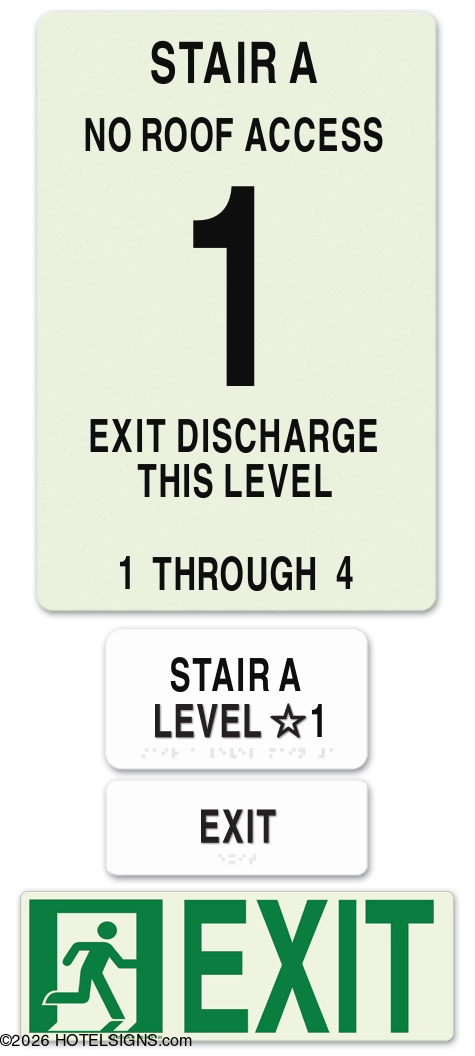 NOTE: Package includes MEA-certified photoluminescent stairway ID sign, tactile level ID sign, tactile exit sign, and low-level photoluminescent egress sign.