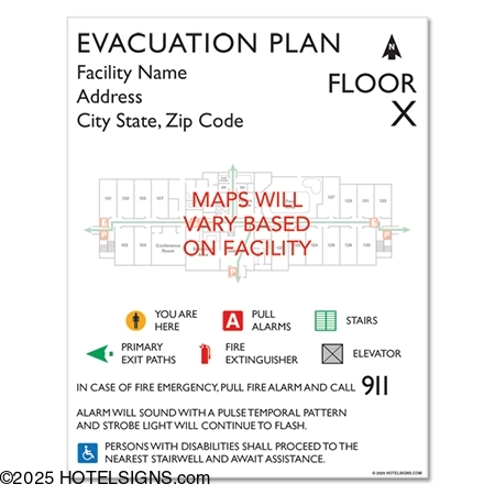 - Identifies "You Are Here" location, fire extinguishers, pull alarms, and escape routes.