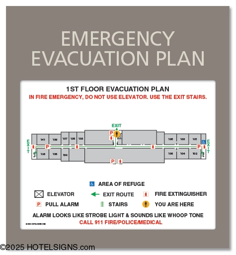 - Clearly identify exits, exit routes, fire extinguishers, pull alarms, stairs, and current location in the event of an emergency.