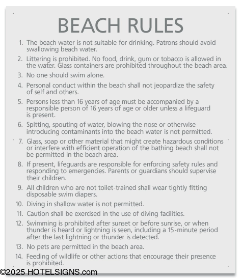 Use to inform and warn guests of beach rules and policies in Illinois.
