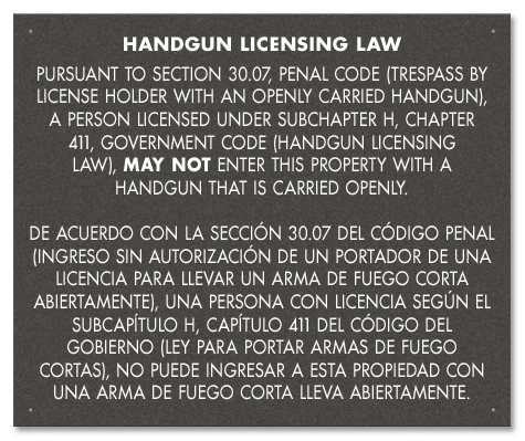 Any Texas property that wishes to prohibit license holders from carrying guns, either openly or concealed, on their premises must have these signs posted in a conspicuous manner visible to the public. Properties that allow open carry but not concealed carry must have 30.06 (page 5) code number. Properties that allow concealed carry but not open carry must have 30.07 (page 5) code number. Properties who do not allow either open and concealed carry guns must purchase both signs.
