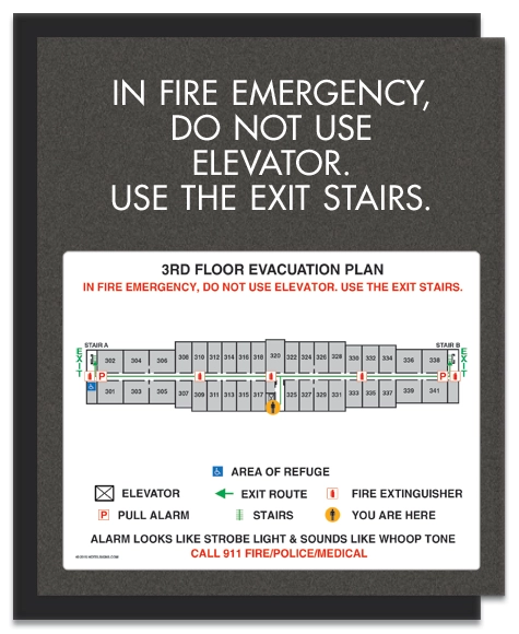 - Post directly above the elevator call button with the top of the sign 72" above floor to instruct people to use the stairs in the event of an emergency, not the elevator.
