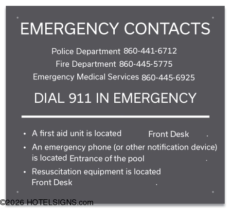 Ensure pool safety by clearly displaying essential emergency contact information with our Connecticut Emergency Contacts Pool Sign. Designed to meet the standards of the Connecticut Public Health Code, this sign provides a vital resource for guests in case of emergencies.