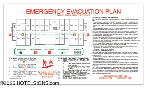 Evacuation Plan w/3 color flip art, state laws, & room rates