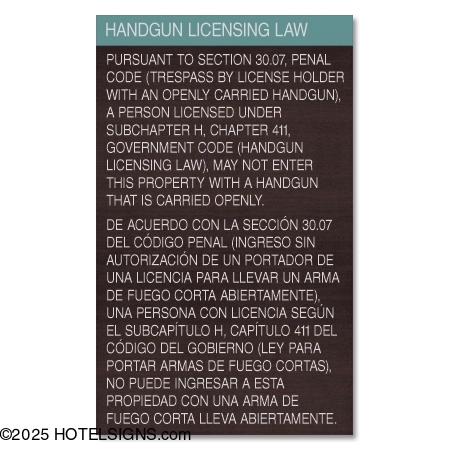 Any Texas property that wishes to prohibit license holders from carrying guns, either openly or concealed, on their premises must have these signs posted in a conspicuous manner visible to the public. Properties that allow open carry but not concealed carry must have 30.06 (page 5) code number. Properties that allow concealed carry but not open carry must have 30.07 (page 5) code number. Properties who do not allow either open and concealed carry guns must purchase both signs.