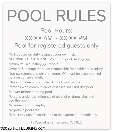 - Specify hours, pool depth, maximum occupancy and age limit.