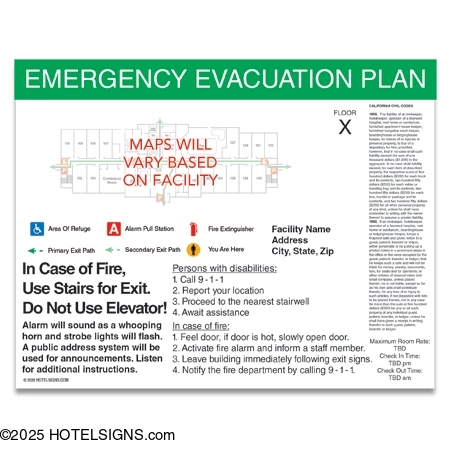 - Complies with California Fire Code section 404.6.2 that states specific evacuation maps must be posted on the interior of the entrance door to each guest room in a hospitality facility.