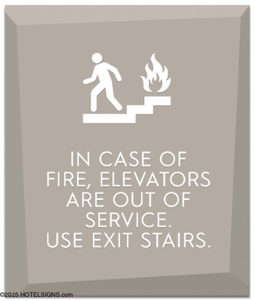Post at an elevator to instruct people to use the stairs in the event of an emergency, not the elevator.