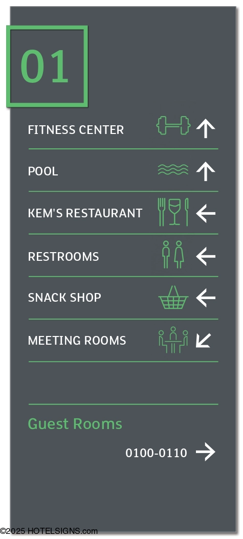 - Use to help direct guests and staff members to their destination as they exit the elevators.