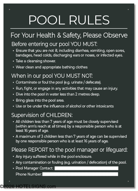 Use to inform and warn guests of pool rules and policies