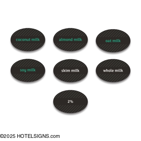 - Includes: 7 vinyl milk labels (2"h x 3"w) to mark milk choices.
