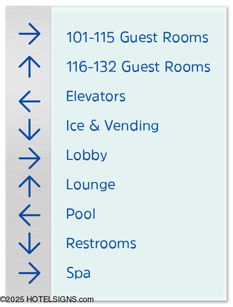 - Features blue edge acrylic with digitally printed text and raised arrows.