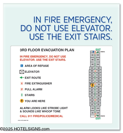 - Post directly above the elevator call button with the top of the sign 72" above floor to instruct people to use the stairs in the event of an emergency, not the elevator.
