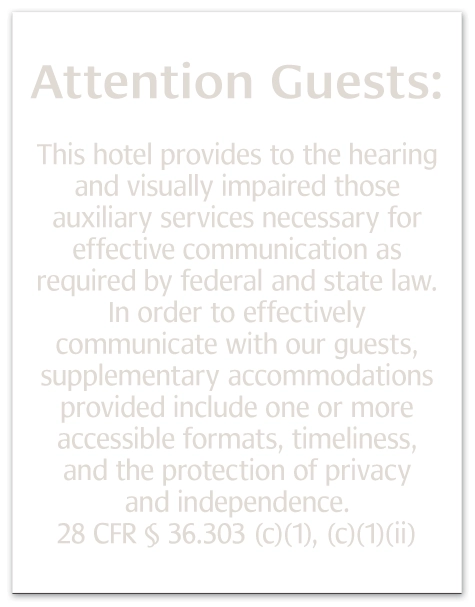 - Informs guests that auxiliary services necessary to communicate are available to the hearing and visually impaired.