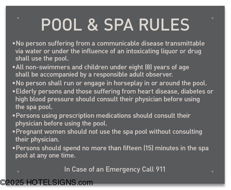 - Use to inform and warn guests of pool and spa rules and policies in Wyoming.