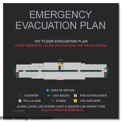 Clearly identify exits, exit routes, fire extinguishers, pull alarms, stairs, and current location in the event of an emergency.