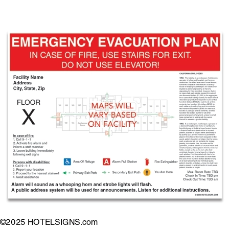 - Complies with California Fire Code section 404.6.2 that states specific evacuation maps must be posted on the interior of the entrance door to each guest room in a hospitality facility.