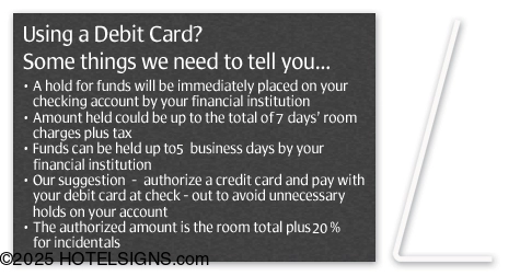 - Debit Card Plaques were designed to inform guests about policies, such as bank holds, when using their card.
