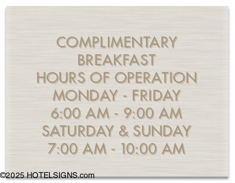 Customize up to 8 lines of text. Suggested phrases: "Complimentary Breakfast Hours," "Gift Shop Hours," etc. Text is raised.