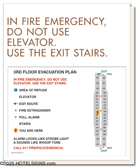 - Post directly above the elevator call button with the top of the sign 72" above floor to instruct people to use the stairs in the event of an emergency, not the elevator.