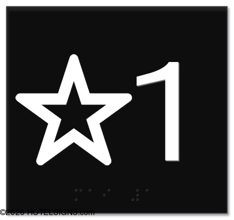 According to California Code 1116B.1.14, raised characters, including the star, shall be white on a black background. The Braille translation for the star shall be "MAIN."