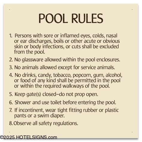 Ideal Applications:Public swimming pools.Community pools and aquatic facilities.Hotel and resort pools.Any location in Phoenix/Maricopa County where pool rules and safety information needs to be clearly displayed.