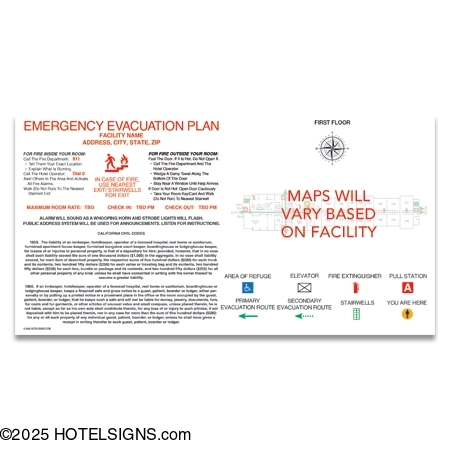 - Complies with California Fire Code section 404.6.2 that states specific evacuation maps must be posted on the interior of the entrance door to each guest room in a hospitality facility.