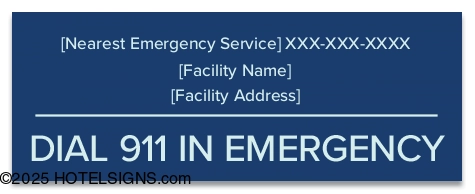 Inform guests of emergency contact information with the Delaware Pool Emergency Phone Sign (SPS-EM1028-DE-1). This "Dial 911 in Emergency" sign is designed to meet Delaware state regulations. Please specify nearest emergency service information, facility name, and address.
